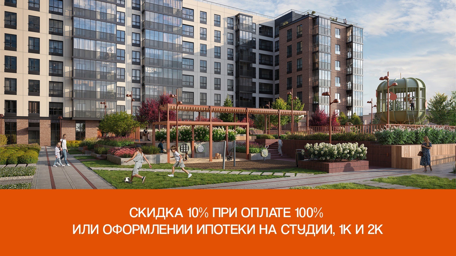 При оплате 100%, а также оформлении ипотеки на студии, однокомнатные и двухкомнатные квартиры действует скидка 10% от базовой цены квартиры.